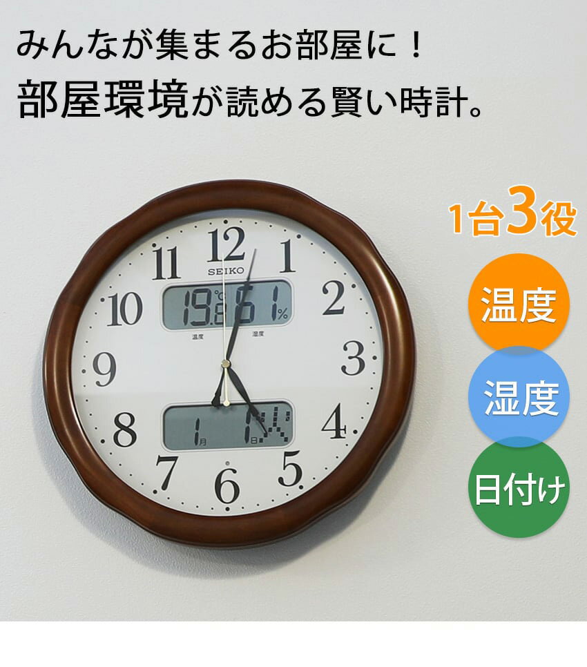 SEIKO セイコー 掛時計 (液晶表示付き) (電波時計)日付も温度・湿度も分かる! 『SEIKO セイコー 掛時計』 掛け時計 おしゃれ 掛け時計 電波時計 見やすい 電波時計 壁掛け セイコー 壁掛け時計 壁掛時計 電波掛け時計 電波掛時計 電波壁掛時計 電波壁掛け時計 湿度計 温度計 カレンダー 日付け アナログ デジタル 液晶 開業祝い 引っ越し祝い 新築祝い 開店祝い プレゼント ギフト 贈り物 リビング ダイニング 洋室 和風 和室 オフィス 店舗 飲食店 カフェ キッチン 寝室 ステップセコンド ステップ秒針なのにほとんど音がしない 静か シンプル ブラウン 木製 熱中症やインフルエンザ対策に